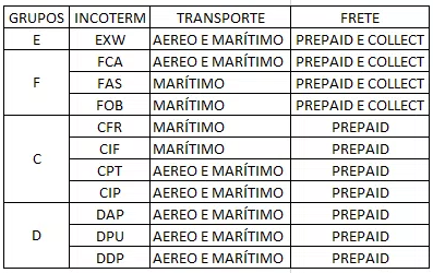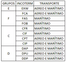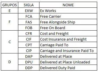 Os INCOTERMS são separados em grupos (E, F, C e D), como podem verificar na imagem abaixo: